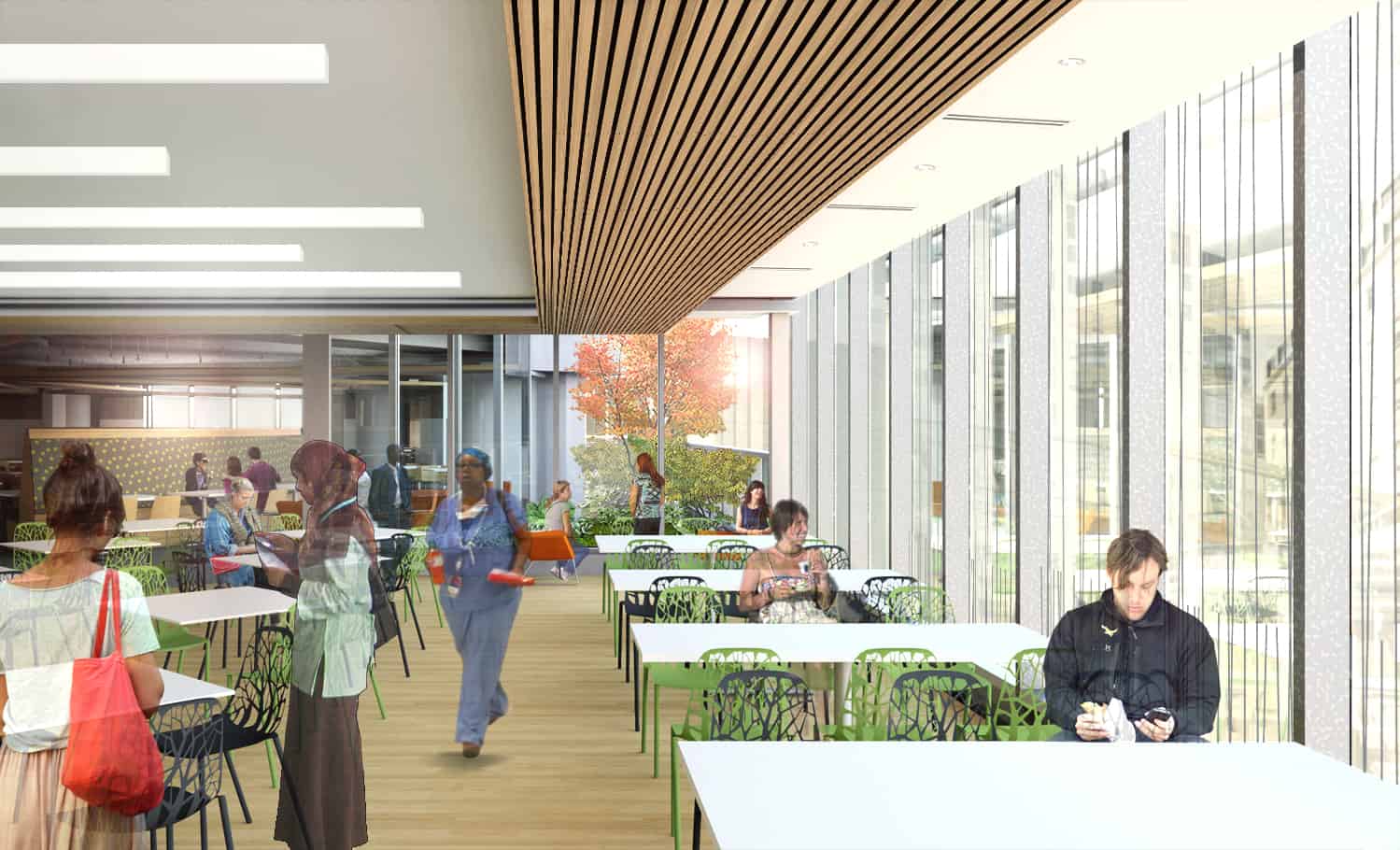 Designed to improve the interior environment, food choices, and customer experience, the project will join the two north pods of the second floor via an addition, replace the exterior building skin at this floor, and completely renovate the cafeteria space. The introduction of large planting beds, natural light, and enhanced views to the exterior are part of a wider initiative by the hospital to bring a stronger presence of nature and respite to its campus.