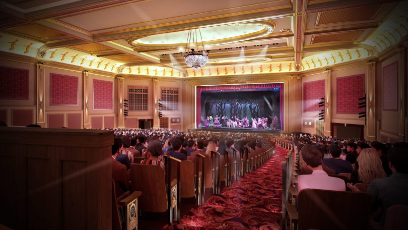 When they began, priorities aligned around improving the patron experience within the 101-year-old, city-owned building. The existing seats, with varying degrees of comfort, were mismatched donations in discordance with the 1923 “Adamesque” interior. The rake of the auditorium floor provided great sightlines but precarious slopes for those with mobility challenges. The restrooms were tired, hailing from the 1980s renovation with only the women’s restroom on the ground floor. The men’s restroom was accessed by a staircase at the back of the auditorium to the basement. Up two steps from the main lobby was the concessions bar, preventing access for many. The inner box office, framed by miniature Corinthian pilasters, was too small to be useful, not code compliant, and created security challenges.