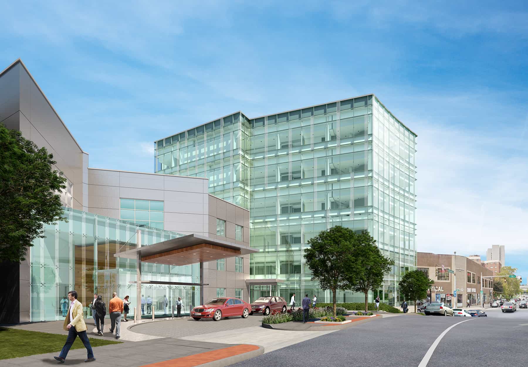 Additional work includes new examination and treatment rooms, offices, conference rooms, restrooms, and amenities spaces. A new pharmacy will be constructed in the basement of the new medical office building. The project will feature a new two-story structural glass vestibule and a suspended porte-cochere, and landscaped areas surrounding the project. An existing four-story brick building was removed from the site at the location of the new structure.