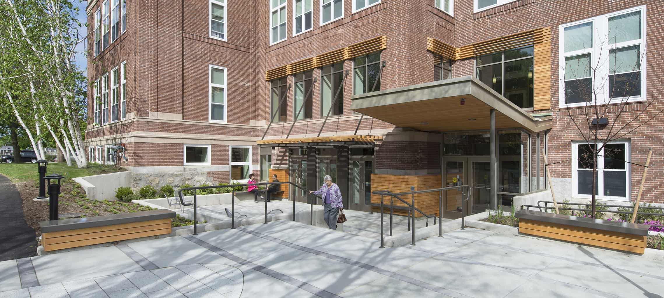 The jury commented that this affordable senior housing project is conventional but well done. In addition to a very handsome entrance with traditional stairs and a well-integrated ramp, there are accessible parking spaces and a recessed patio with terraced green space. French doors and benches provide intuitive way finding and places to rest for the frail.