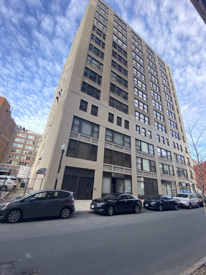 The 14-story building is constructed of brick and precast stone; the bottom four floors of precast stone and the upper floors are a blend of stone and brick with precast panel insets and sills. The project focused on the elevation at the intersection of Kneeland and Hudson Streets.