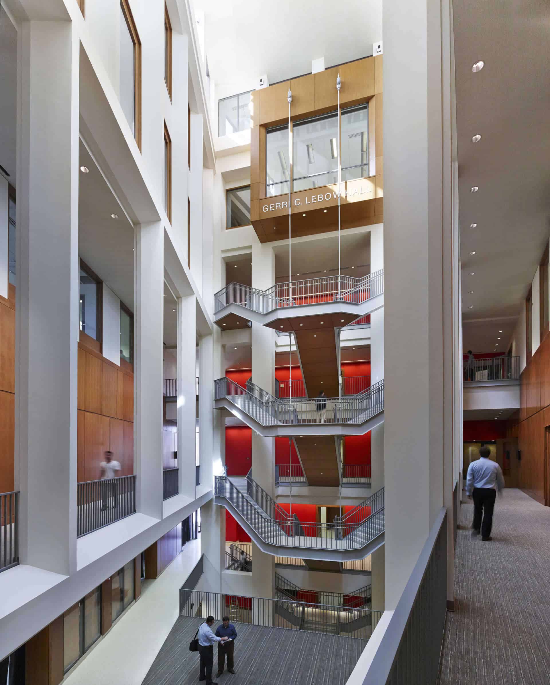 Designed around a central five-story atrium accessible from main entrances at the three corners of the building, the new LeBow Hall includes a mock trading room, a 300-seat auditorium, a 160-seat multipurpose space, and a 100-seat lecture hall. The building also houses classrooms, a behavioral research lab, a recording studio, student lounges, collaboration/study rooms, a dean’s suite, and faculty offices.