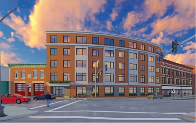 Rees-Larkin’s Moran Square Redevelopment will convert the former Summer Street Fire Station into two apartments, redevelop the former 3-story commercial Harper Building into 14 apartments, and construct a new, 5-story building with 28 apartments between the two structures, with a common corridor and common mechanical systems linking the three buildings. There will be one studio apartment, 14 one-bedroom apartments, 23 two-bedroom apartments, and six three-bedroom apartments. The project will also create 8,200sf of commercial space.