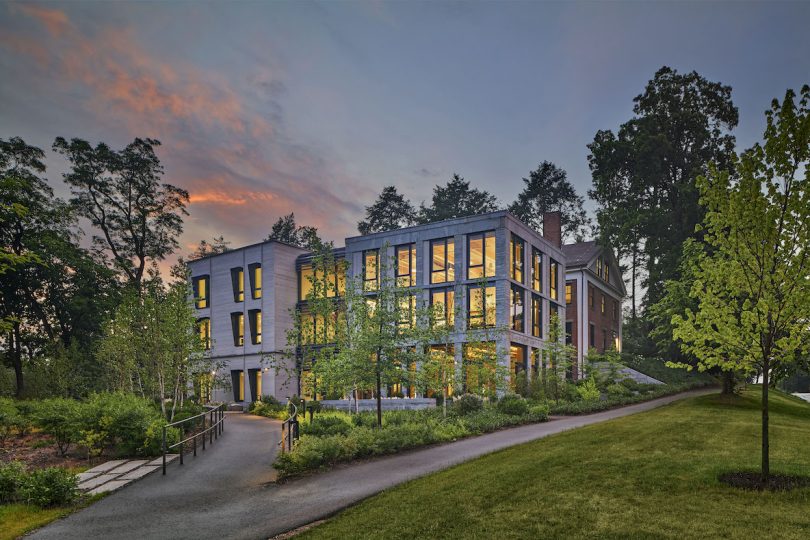 Located on South Pleasant Street, the project is the incubator for a new campus district. It conjoins an extant Greek Revival house with contemporary construction to create a setting for exploring the human condition. The house’s interior was modified to provide a program of offices, classrooms, and support spaces. A new 2-story addition is situated next to the house, separated by a transparent exterior wall. These two volumes contain the project’s large public spaces, an event space, and a flexible classroom. A new 3-story office wing wraps behind the house to create a linear band of offices looking west into the building’s natural setting. Outdoor terraces, along with an open, central commons created by the adjacencies of the lyceum’s offices, classrooms, and ground floor event space, are designed to provide a vibrant place for the community to share thoughts, ideas, and work.