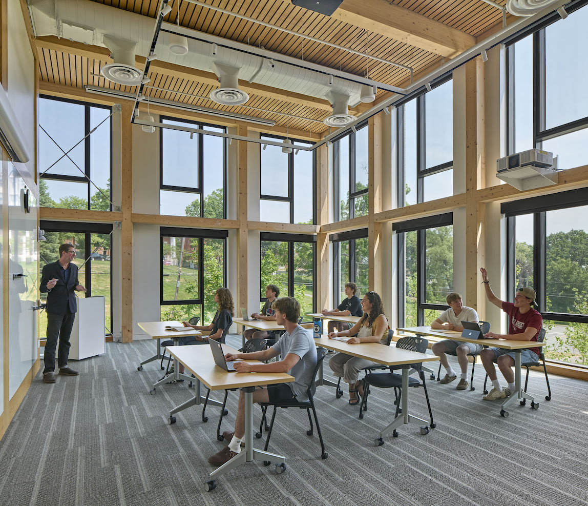Supporting the college’s commitment to carbon neutrality by 2030, the lyceum showcases low-carbon design. Its interior and exterior palettes prioritize materials with low amounts of embodied carbon as well as products that can store carbon, such as wood and other plant-based materials. The building’s envelope is highly insulative and airtight, coupled with all-electric mechanical systems and a 31 kW roof-mounted solar array. The resulting design required an extremely low 69 kg/co2/m2 of embodied carbon to construct the building and is predicted to use only 14.5 kbtu/sf/year of operational carbon. Indoor air quality, operable windows, a daylighting strategy, a verdant landscape, and views of the surrounding environment are additional featured designed to enhance occupant well-being.