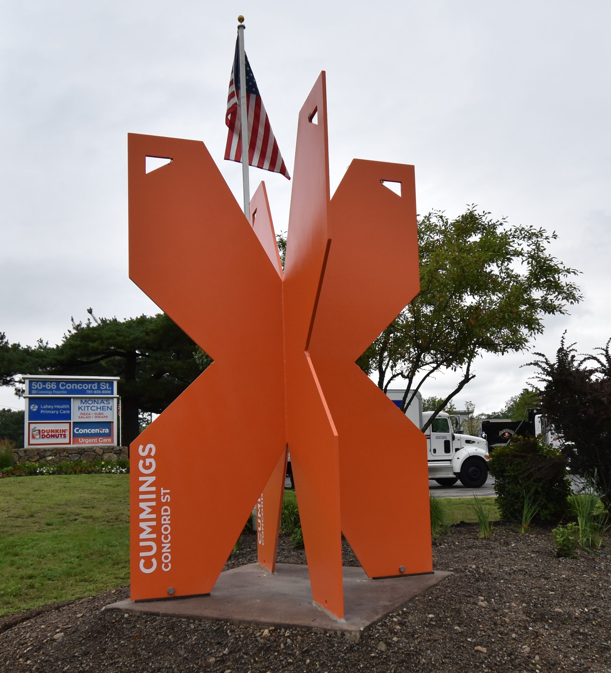 Finished in Cummings’ signature orange color, these symbols are crafted in steel and stand at nine feet. Twelve monuments have thus far also been installed at the firm’s business and technology parks in Woburn, Wilmington, Stoneham, Beverly, and Andover, and 10 more are in fabrication in Woburn. The company has also donated a sculpture to Cummings School of Veterinary Medicine at Tufts University, in North Grafton.