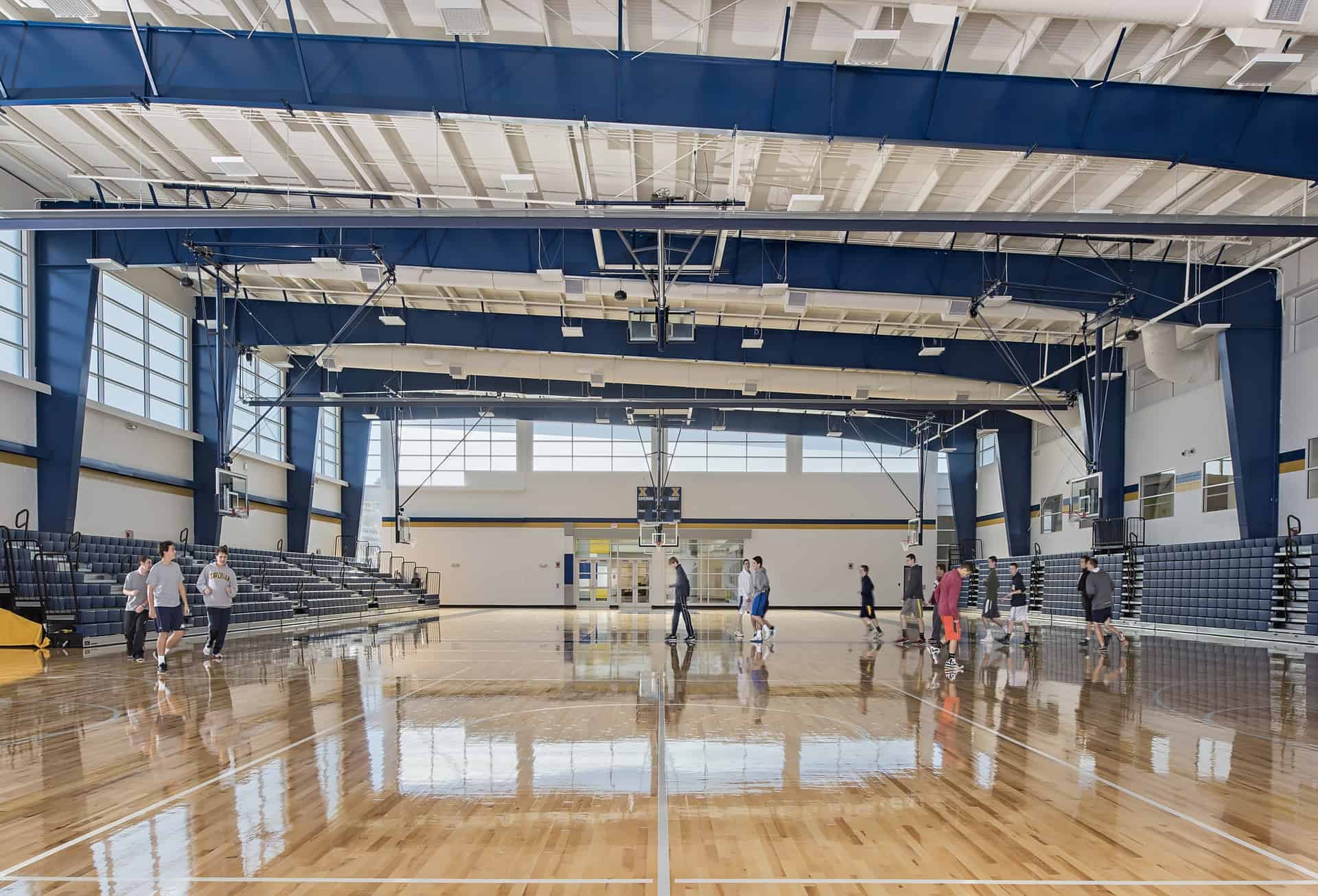 The 30,000sf addition and 15,000sf renovation includes a three-court gymnasium, locker rooms, fitness center, office space, athletic storage, and an entry lobby that spatially ties the athletic program elements to the academic wings of the school.