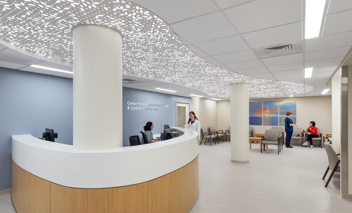 The newly designed outpatient clinic accepted its first patients in June. It consists of 10 exam rooms; several specialized spaces for performing echocardiograms, stress-tests, and ultrasound; and two infusion treatment rooms specific to the care of heart failure patients. Staff spaces were designed to balance off-stage areas to allow for respite and focus with on-stage open nurse stations and carefully positioned sightlines. Footsteps and travel distances were of paramount focus throughout the design, both for staff operational efficiency and patient experience.
