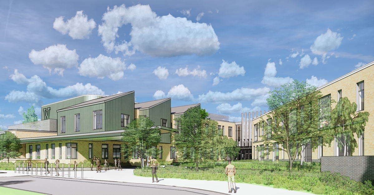 An additional 220,880sf of entirely new construction will complete the new school. The two-story building will house students in grades six to eight totaling 1,470 students with three academic wings located around a centrally shared space which doubles as a dining room. There is also an administration/auditorium wing with areas for music, art, and a makerspace.