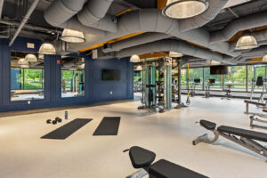 New first floor amenities include the lobby, atrium, coffee bar, cafe, kitchen, and fitness center, as well as an outdoor patio and outdoor fitness area.