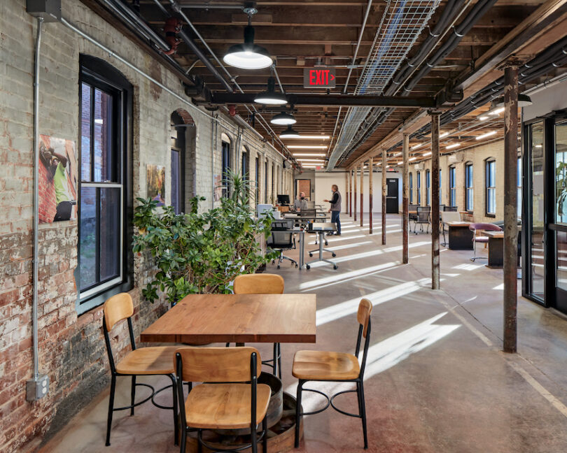 Opaque fiberglass windows, originally installed to block views of the gold leafing operation and to resist shattering, have been replaced with well-crafted black-framed glass windows. Most of the brickwork was left untouched. New steel awnings clearly mark entrances, and inside, new programs are identified with fresh signage among the building’s old columns and wood floors.