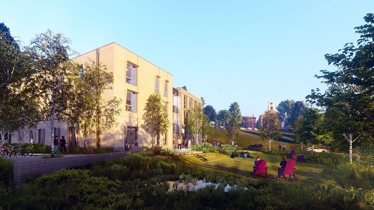The lyceum will be a “smartly sustainable” building, designed to support the college’s commitment to carbon neutrality by 2030 and to showcase low carbon construction. The interior and the exterior materials palettes will prioritize those with lower amounts of embodied carbon as well as products that can store carbon, such as wood and other plant-based materials. Indoor air quality, operable windows, a daylighting strategy, and views to the surrounding campus environment are all designed to enhance occupant well-being. The new building will include efficient mechanical systems and the building’s envelope will be highly insulative and airtight.