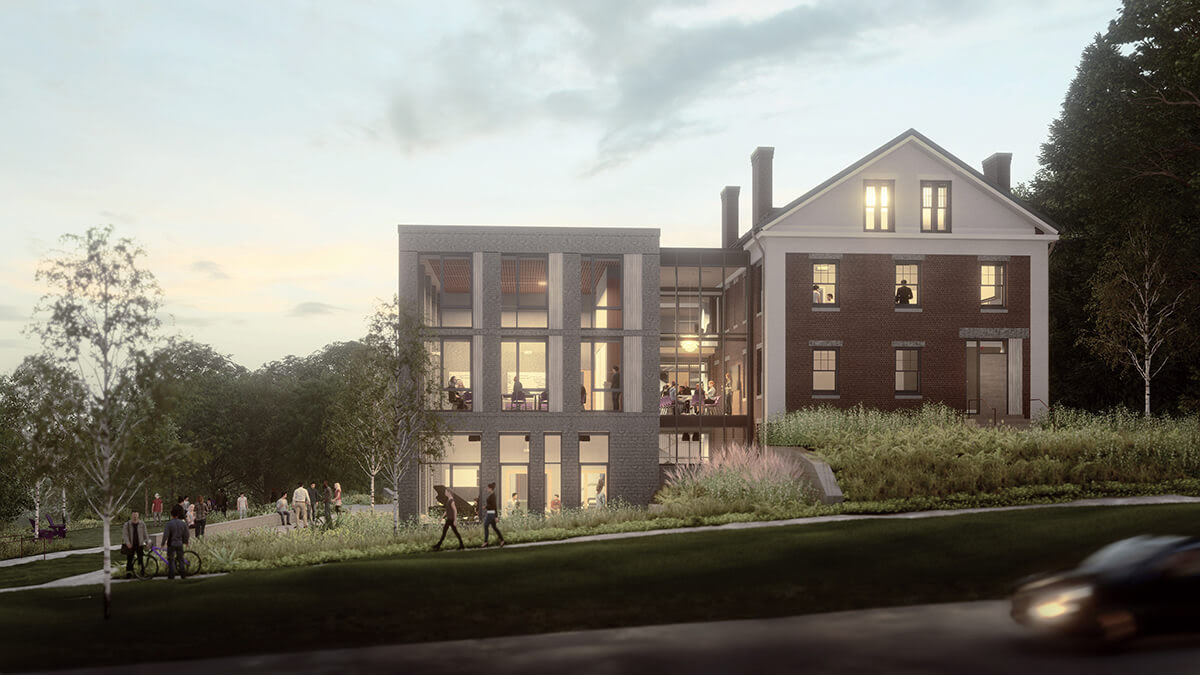 The historical house will comprise the core of the project, its footprint augmented by an addition that extends to its south and west. Its expanded interior will be modified for a program of offices, classrooms, spaces for informal study, multipurpose rooms, and support spaces. A new 2-story addition will be placed next to the house along Pleasant Street, separated by a transparent exterior wall. These two structures will contain the larger, more public spaces, an event space, and a flexible classroom. A new 3-story office wing within will wrap behind the existing house and create a linear band of offices looking west. The project’s inclusive design intends to leverage the adjacencies of offices, classrooms, a ground floor event space, and an outdoor terrace – all connected by an open central commons – to establish multiple places for the community to share thoughts, ideas, and work.