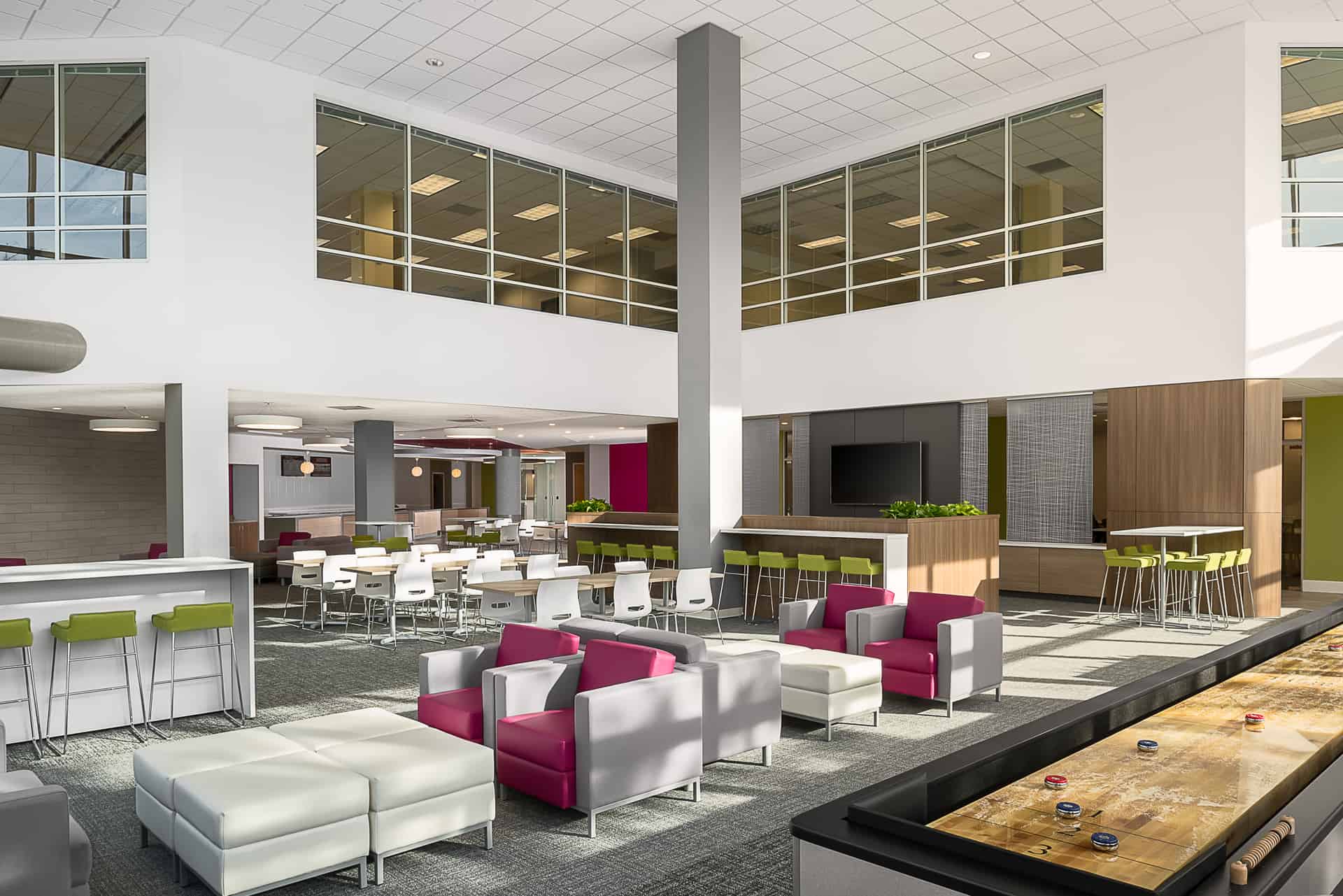 virtual ride instruction, and the addition of meeting/conference space adjacent to the café, allowing tenants to reserve these areas for larger group meetings, as well as designated spaces within the café for gaming such as foosball and Ping-Pong. Exterior improvements include patio seating with complimentary Wi-Fi, a fire pit, and a multi-sport court.