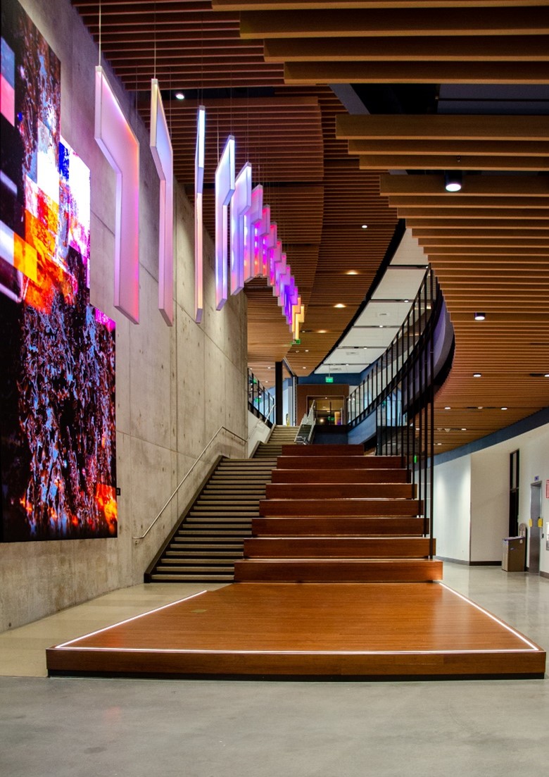 Each floor within the building is dedicated to a different art discipline with common areas throughout to encourage spontaneous performances and instruction. All levels offer flexible classrooms and different learning environments, including a STEAM lab where students can explore how subjects like math, science, and technology intersect with the arts. Large public spaces, such as the lobby, double as art galleries where student work is displayed. The school also has a 500-seat theater featuring a proscenium stage.