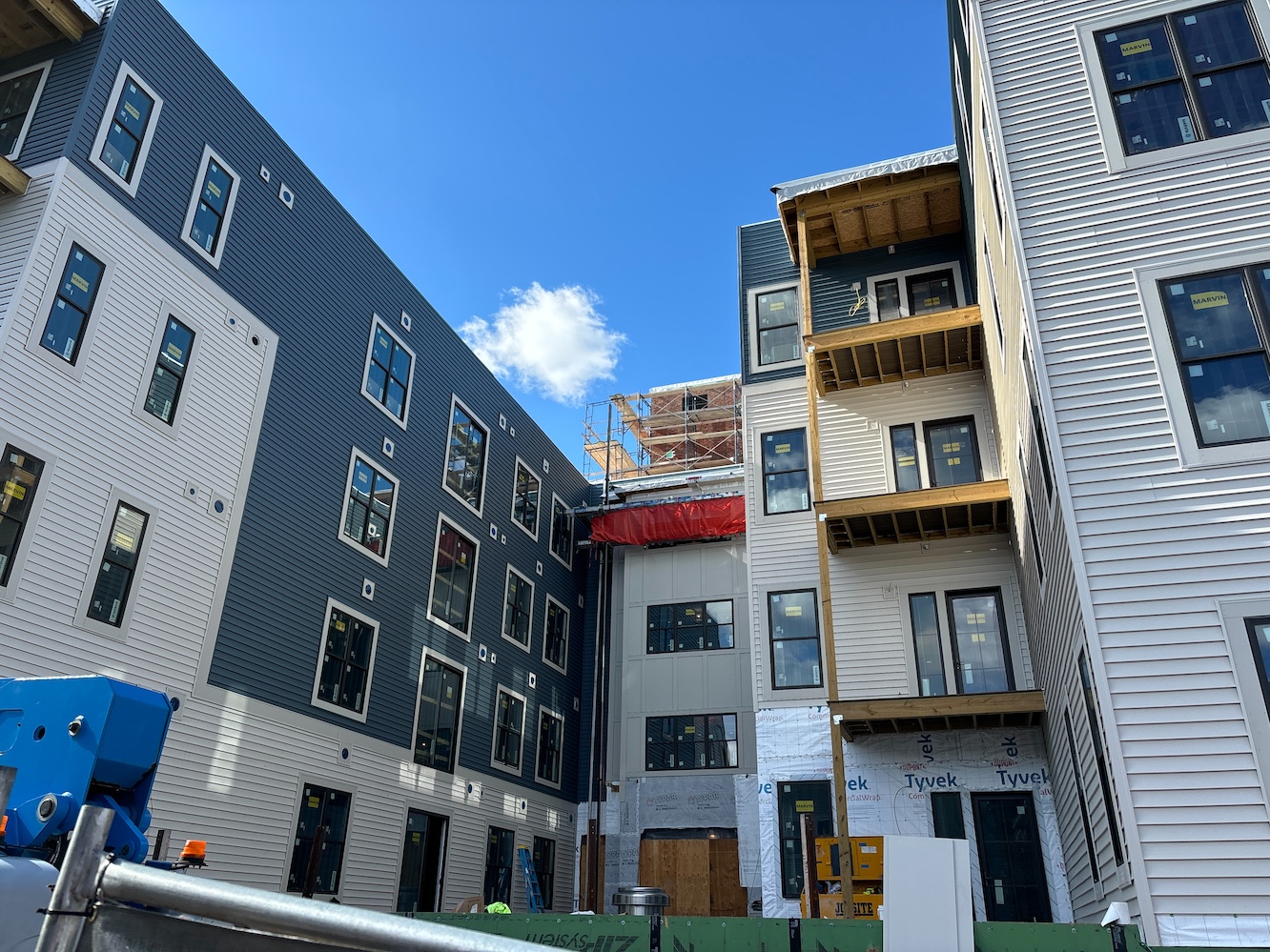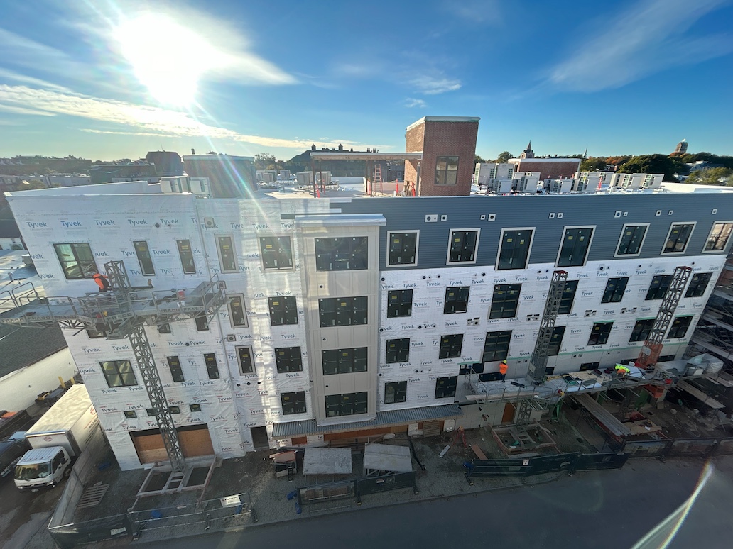 Exterior work is well underway, with siding and trim in progress. Siding consists of a combination of vinyl plank, fiber cement boards, and thin brick veneers. Installation of the storefront entry system began in mid-October, marking significant progress toward the completion of the building’s facade.