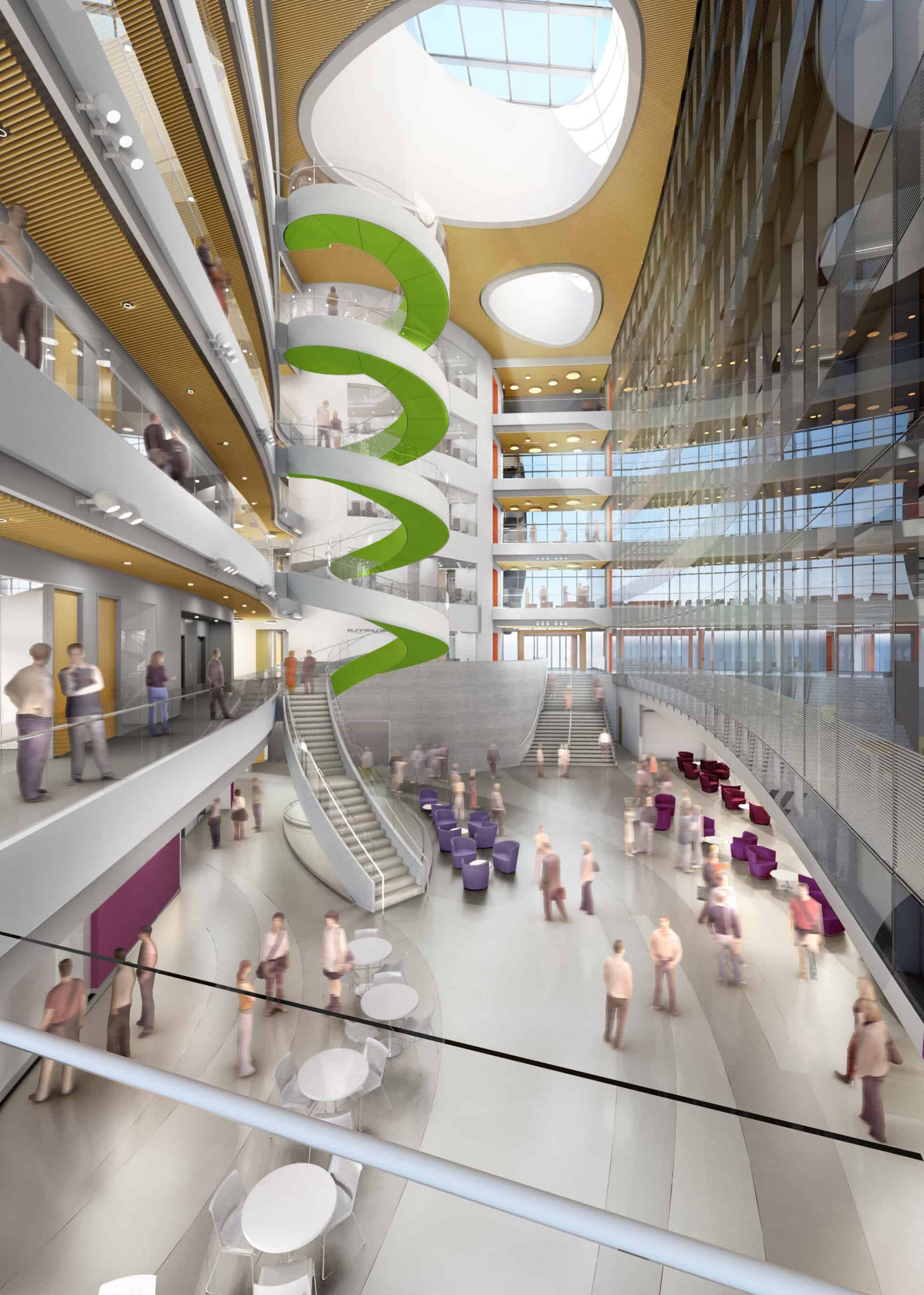 The inside of the building includes a massive steel staircase that will spiral up a glass-filled, six-story atrium. The atrium will double as an event space big enough to seat 200 people for dinner, and a 280-seat auditorium will also be built on the ground floor. The facility will also feature laboratories, classroom space, and offices for faculty and graduate students.
