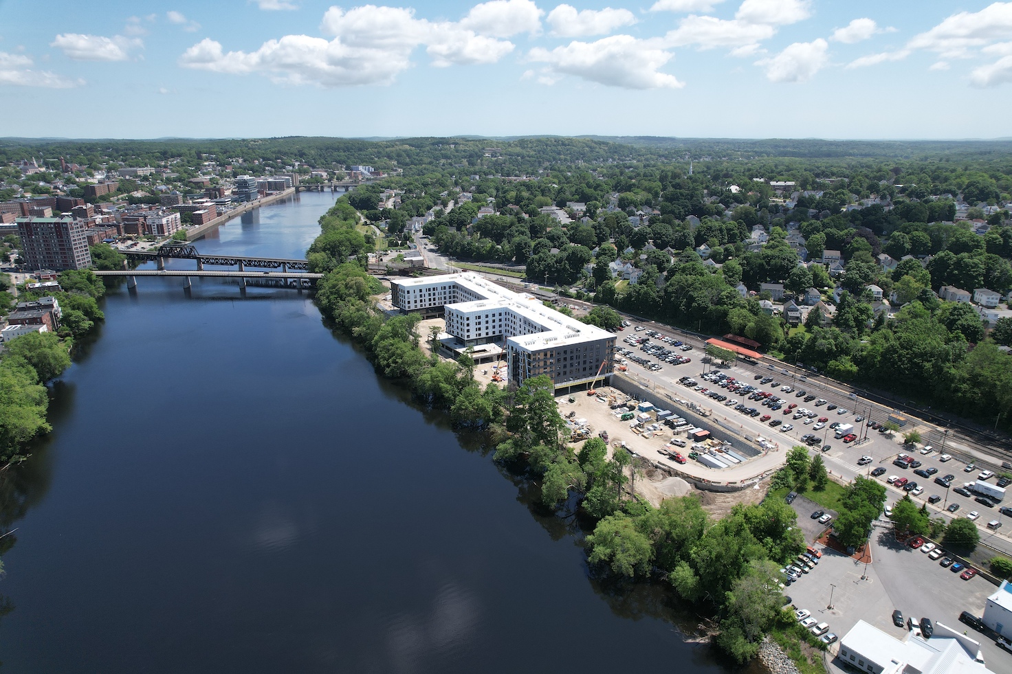 The 5-story, transit-oriented development, situated adjacent to the Bradford MBTA commuter rail station, is now proceeding with interior fit-out and facade finalization. The weather-tight status comes as other development milestones take place, including the start of construction on the new 1.4-acre public waterfront park, and the implementation of roadway improvements as a part of a $1.95 million MassWorks grant.