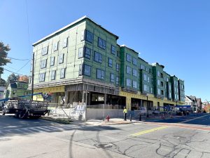 Construction is in full swing on all four townhouse duplex structures and the 46 unit, main building along the Route 135 frontage. All buildings are framed out and substantially weathertight with roofs completed, windows installed, and exterior insulation and siding underway on the townhouses with plans to start brick facades on the main building in November.