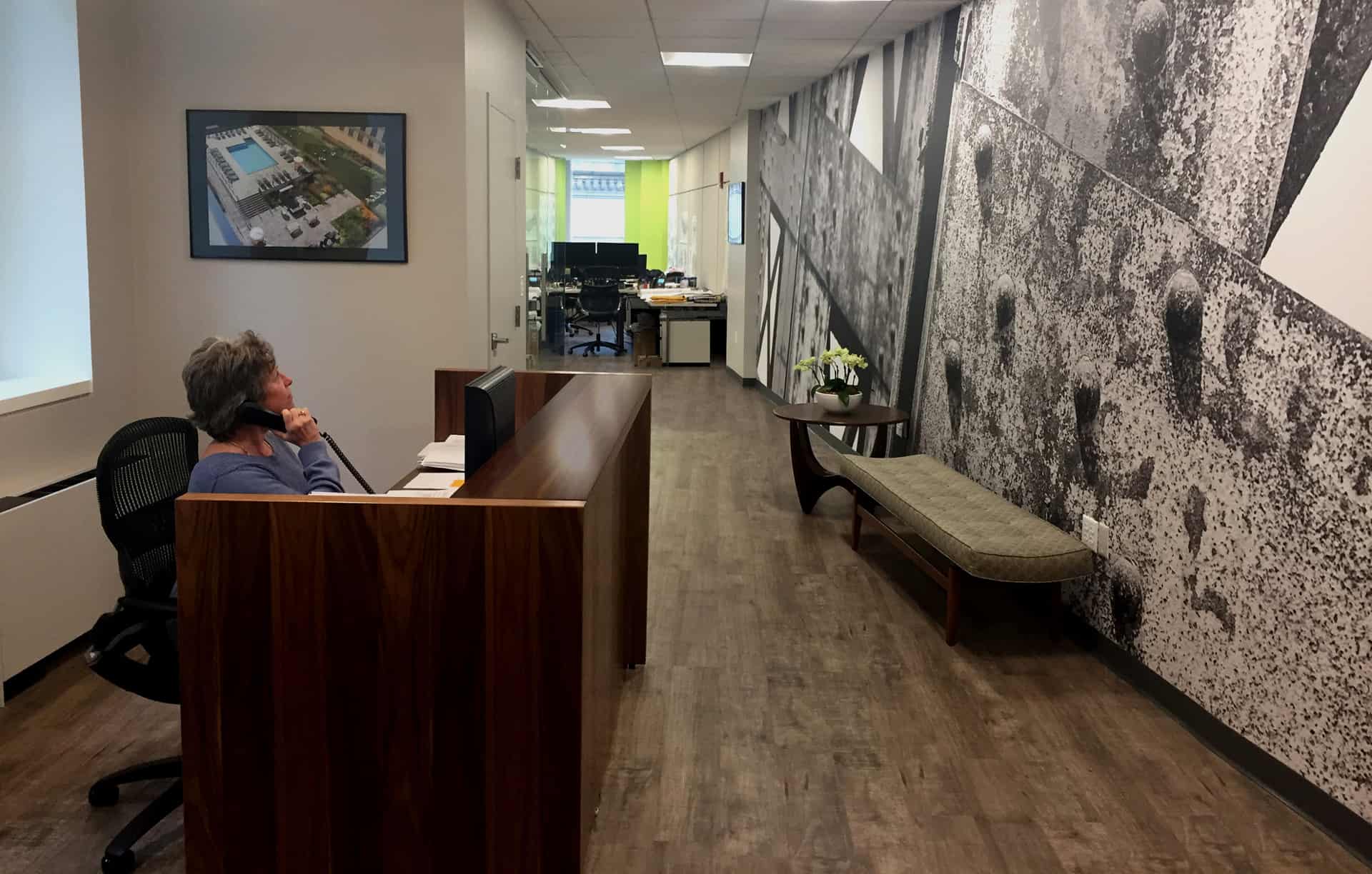 Copley Wolff’s new office is bright and airy and features oversized windows, ample natural light, collaborative work stations, and integrated technology. Notable design elements include a 40-foot-long feature wall depicting elements from one of the team’s most prominent projects — the award-winning Assembly Row in Somerville.