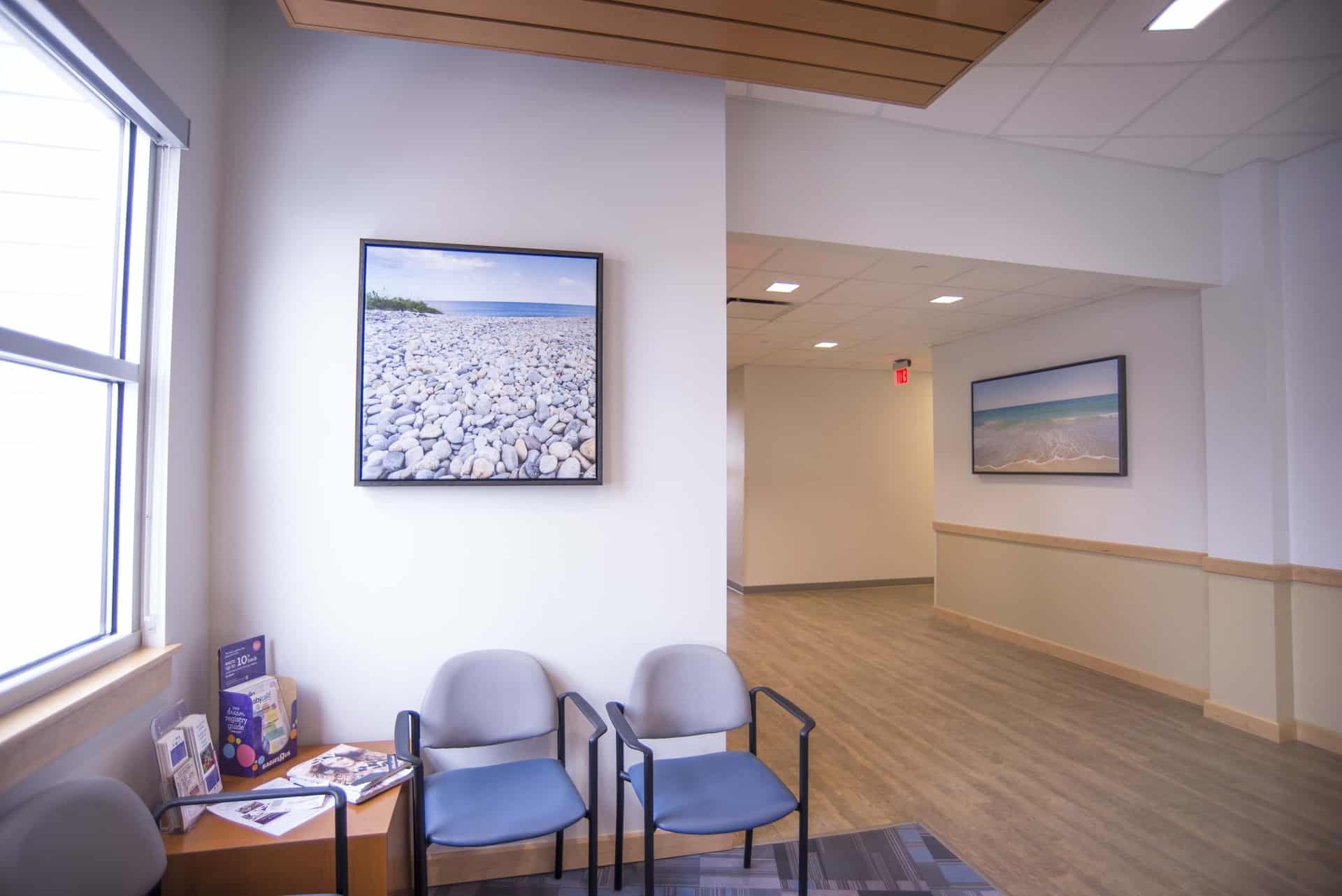 A total of 41 artworks ranging from photography, painting, and sculpture was incorporated into the Thundermist facility. Seascapes can begin to look the same; to keep the artwork refreshing, Rignanese made sure to use pieces that were original and dynamic. Photographs of local beach scenes were printed in-house, on large-format printers, and stretched as a gallery wrap for the exam rooms. Abstract images with strong nautical elements were displayed using a floater frame, giving the works a contemporary feel.