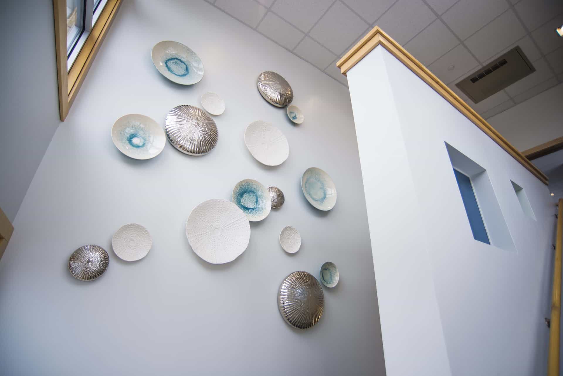 In a large stairwell with windows to the outside, Rignanese took the opportunity to do a grand 3D installation of ceramic water creatures. Silver and white concave and convex sea urchins highlighted by blue accent bowls filled the walls of the stairwell. The installation can be seen from the parking lot and has a high impact as soon as the facility is in view. As Corporate Art Group continues to create custom interior art designs for health care facilities, they constantly inspire to style a sense of hope within the walls.