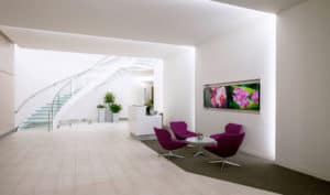 A complex design of “stepped” folding walls and ceilings feature embedded LED lights that frame the eye through the lobby, to the vestibule of the main entrance where University Park Common is visible. Delicate recessed LED wall washers follow the folding geometry to create a cascade of light. Light-colored wood-paneled walls balance the cascading effect of the walls and ceilings while providing a neutral backdrop. A custom-made quartz reception desk offers visitors a veritable art piece in the museum-looking space, and a cozy sitting area adjacent to reception features two LCD screens recessed into the wall to display a building directory and other news.