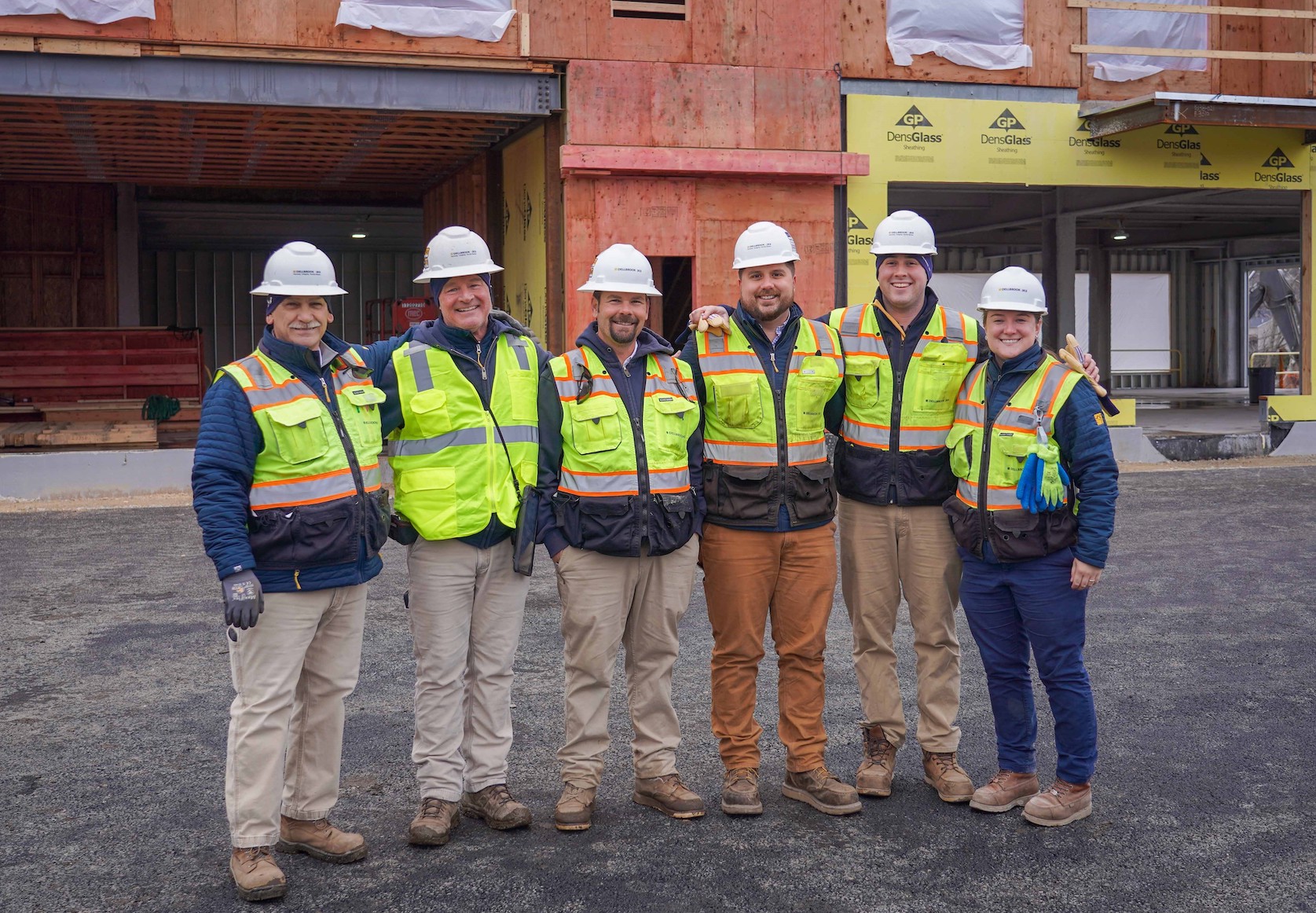 (l-r): Al Nassar; Keith Shepherd, superintendent; Kyle Harris, assistant superintendent; Lou Mascolo, project manager; Kevin Power, assistant project manager; and Devin Cudmore, field safety & risk manager