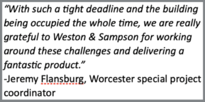Once those obstacles – and Covid – were finally overcome this past spring, the City of Worcester reached out to Weston & Sampson through the city’s house doctor program to design and provide a new sprinkler system for the 16,500sf, 3-story building. In addition to a very tight budget with no wiggle room for unplanned changes, the new fire protection and accompanying electrical systems had to be installed and operational in an eight-week “fast-track construction” schedule, between the end of the school year in June and the beginning of the new school year at the end of August. Adding to the project’s complexity was that school staff and administration were in the building during the entire project, so their health and safety had to be taken into consideration.