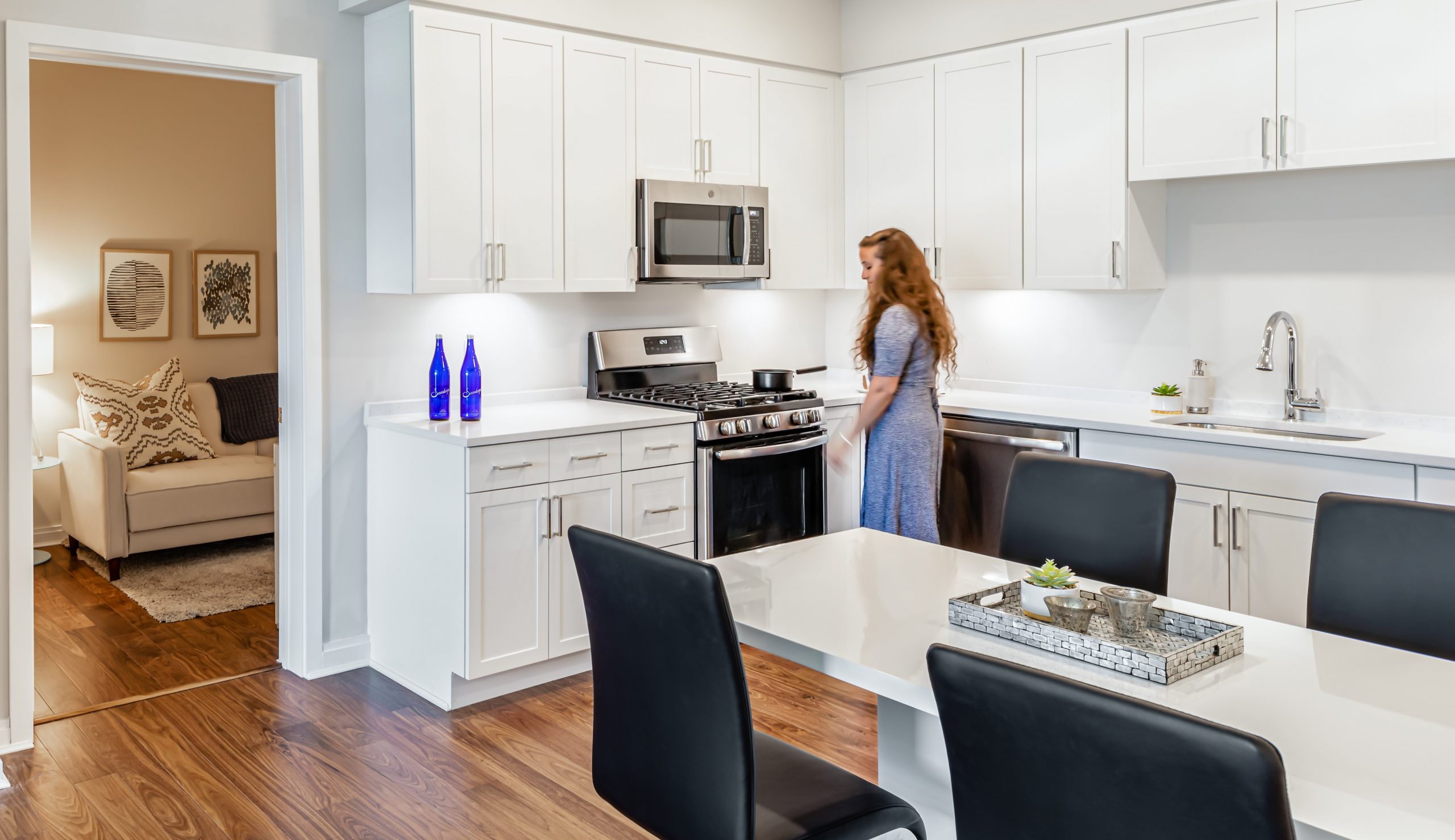Interiors are contemporary and provide a fresh hospitality-focused experience that extends from the lobby and circulation areas into each unit to create a seamless luxurious environment. Amenities include a communal roof deck with various seating options and grills, a club room, parking, pet spa, and concierge services include dog walking and dry cleaning drop off and pick up. Standard finishes feature custom cabinets, quartz countertops, wood floors, and sleek bathrooms.