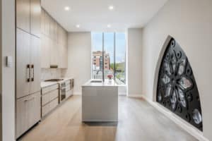 The Lucas is a half mile from two T stops, local retail, restaurants, and parks; within 1 mile of Boston Common, Boston Public Library, theater district. Each of the 1 to 3-bedroom units are completely individualized, based on unique architectural details. The existing Victorian Gothic features of the stone walls, tower, and arched windows are seamlessly blended with contemporary glass and steel. The design team sought to marry the old and new by retaining the architecturally significant landmark’s tracery windows, front doors, and other artifacts