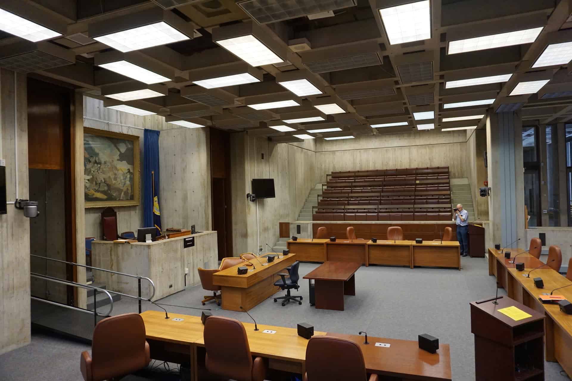 In addition to accessibility improvements noted above, improvements to the room’s acoustics, replacement of lighting fixtures, and upgrades to telecommunications and audiovisual systems will be included. The firm is working in collaboration with Meek Consulting Group for the design and installation of new carpeting, replacement of the councilors’ desks, and selective replacement of other movable furniture.