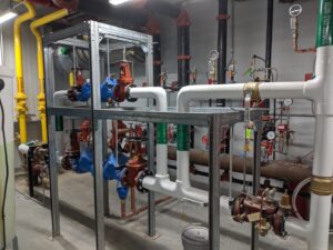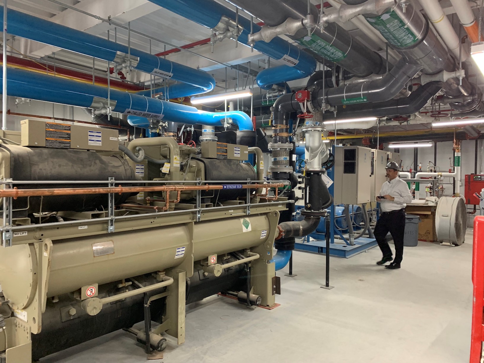 The building design needed to strike a balance between energy efficiency, operability and cost effectiveness while being able to be a showpiece for the Milford campus and prospective clients. Fitzemeyer & Tocci accomplished this through several design features. The first energy conservation measure came by incorporating the use of adiabatic coolers to handle the large process cooling and building cooling load. Due to the high cooling water demand within the building resulting in the need for 2,000 tons of cooling, the design resulted in seven adiabatic coolers with a total water reduction of approximately 90% when compared (and modeled) to standard cooling towers. Large air handling units that provide ventilation to the high-bay manufacturing spaces were furnished with variable frequency drives (VFDs) and interfaced with process exhaust systems in order to provide the necessary makeup air and ventilation, and nothing more.
