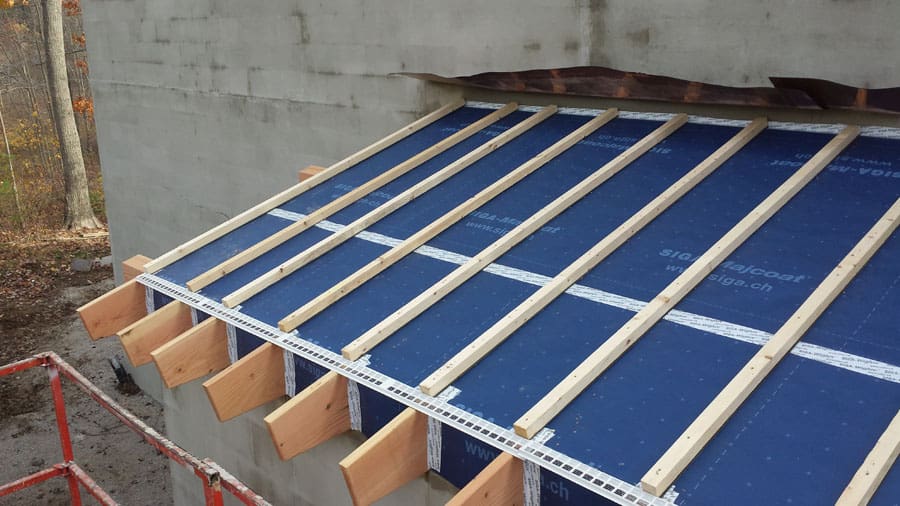 The Comfort Block home is now under construction in the quaint town of Kennebunkport. The architect for the home, Hans Warner of Warner Design Associates, Portland, designed the house with many of the current Passive House principles in mind. The main body of the house faces south with large windows, which allows the sun to heat the house during the coldest months in Maine. The north side of the house has much smaller windows, limiting the loss of heat during the winter yet still allowing cross ventilation through the house during the summer. Overhangs on the roof function as protection for the house from the rain as well as creating shade over the windows during the summer months to prevent heat gain. Intus triple-pane windows from Lithuania were chosen to increase the overall insulation performance of the house, as well as a Siga high-performance house wrap from Switzerland for the hot roof. Siga window tape was also used to seal up any air leaks around the windows. Mineral wool insulation will be used in the rafters and cross insulated to create better thermal breaks.
