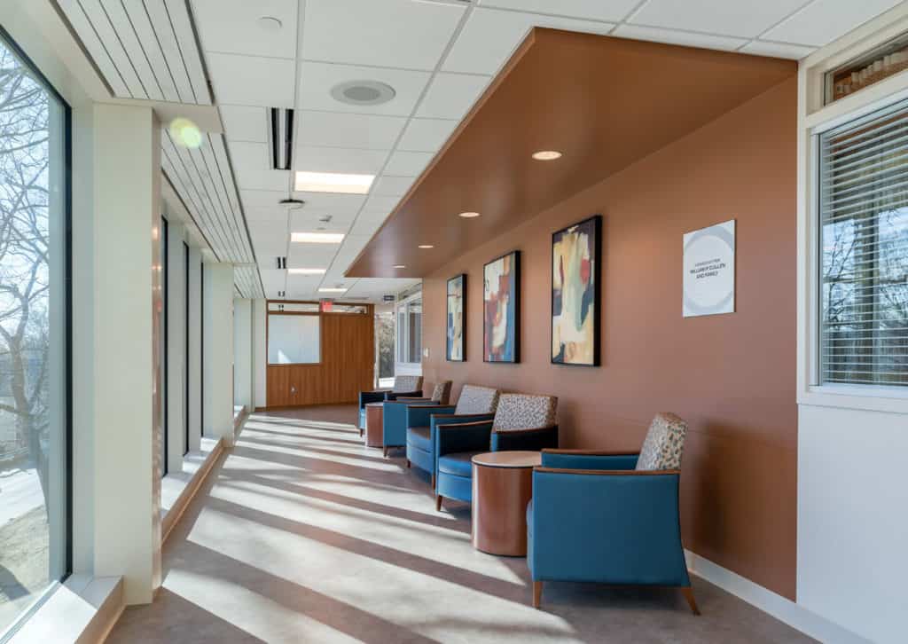 To support this clinical space was an expansion of the existing floor plan that created a new exterior wall, racetrack style corridor, multiple family rest/meeting areas, and a shared lounge. This area was created by an addition of a stunning two-story glass exterior curtainwall that wraps around the new exterior of the building. This curtainwall was installed below an active ICU that was kept in full-time operation. A new 5,500sf healing garden was created in the adjacent outdoor space for patients, families, and staff to visit.