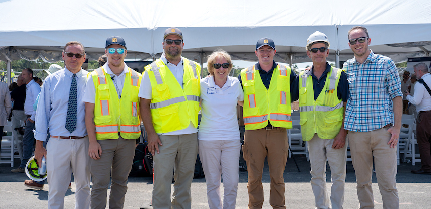 The Dellbrook|JKS project team (l-r): Scott Mitchell, project executive; Nick Cenzalli, field intern; Dan Carll, assistant superintendent; Heidi Dumais, project accountant; Kevin O’Brien, assistant project manager; Mike Leone, superintendent; and Dan Landry, project manager