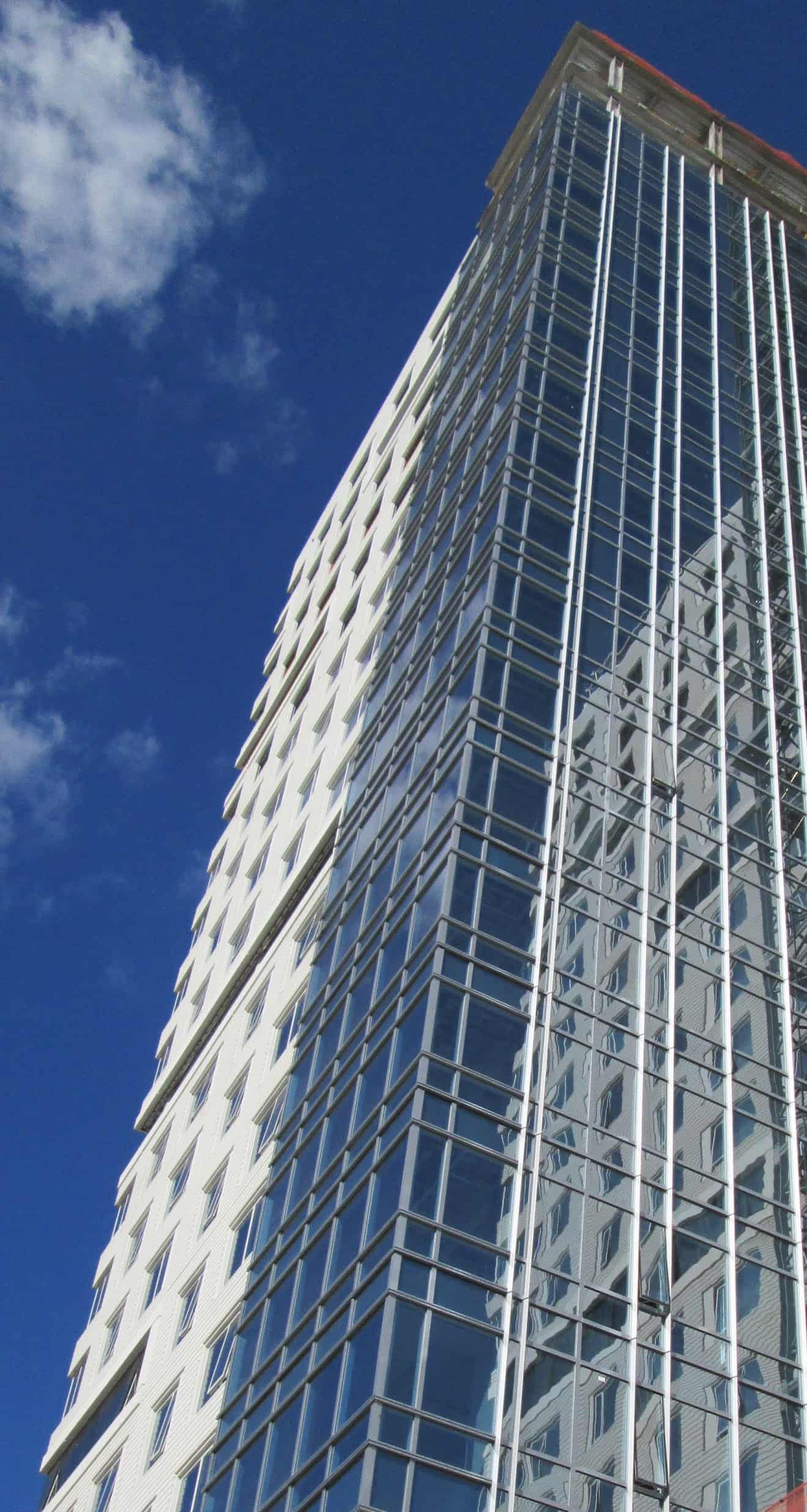 The development of 21 stories and 369 residential units features an L-shaped tower on a three-story rectangular base. The upper level of the base includes a swimming pool and other amenities. Precast concrete slabs and structural walls were specified to provide support for the pool.