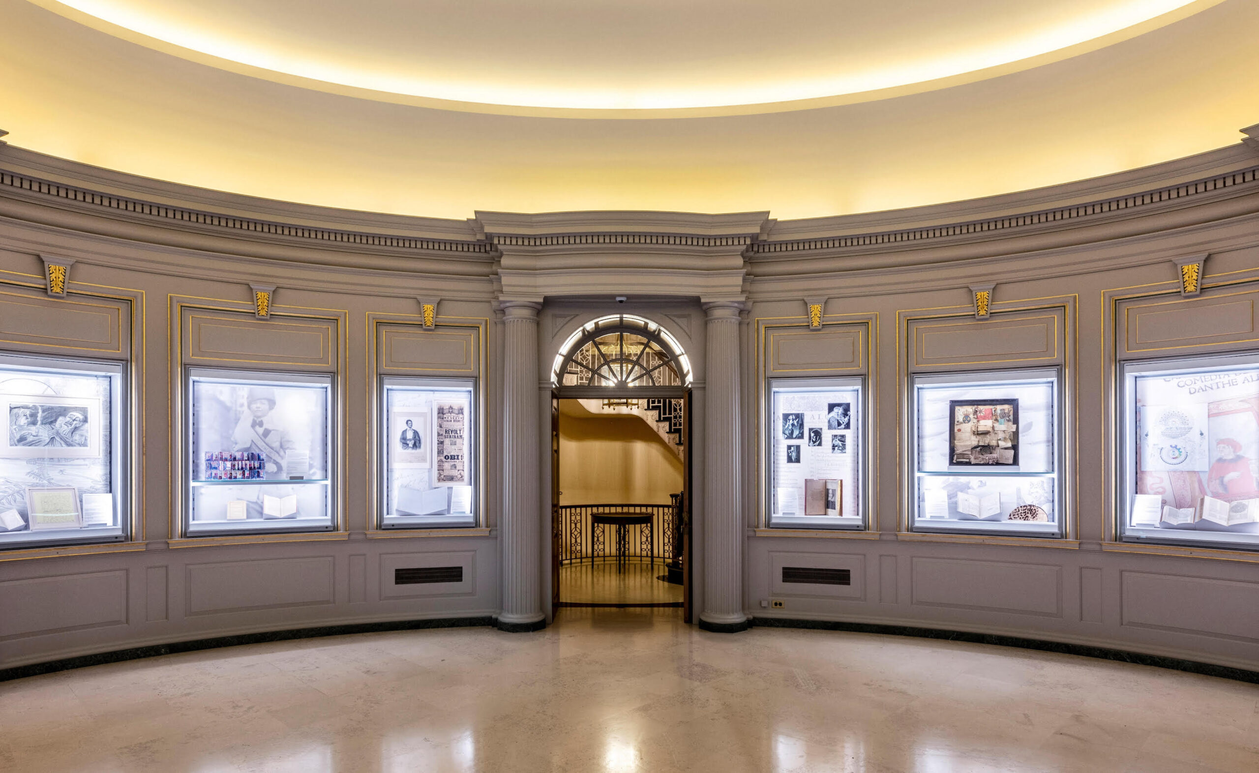 ABA’s design modified the library’s oval lobby, unaltered since its completion in 1942, to create a new display setting for the library’s special collections. Two openings, aligned with exterior windows, were created in the lobby, connecting the interior to the new forecourt and introducing natural but modulated light to the lobby.