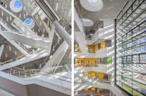 “This innovative and architecturally significant new complex has been constructed on top of existing foundations and basement spaces created for a different project, offering a chance to reduce embodied carbon while addressing a unique set of complexities for the design team in delivering a modern, vibrant space fitting both the client’s and architect’s aspirations,” says Craig Schwitter, P.E., senior partner and chair of the global board for Buro Happold.