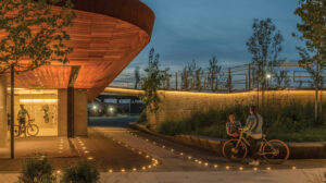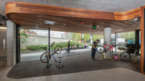 The elevated, half-acre public green includes an interior wood-clad bike pavilion located underneath. In their respective award announcements, both the IAA and ASLA praised the unique, sloped topography of 6 Stack Street’s green that serves as an innovative buffer for the Hood Park campus, protecting it from noise and pollution caused by the surrounding interstate and nearby industrial areas. Intentionally designed to proactively address environmental issues, the sloped design also raises the project out of future coastal flooding zones and provides stormwater storage to accommodate runoff for current and future buildings on-site.