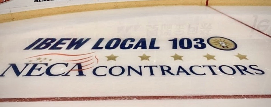 Boston – The International Brotherhood of Electrical Workers (IBEW) Local 103, and the National Electrical Contractors Association (NECA) of Greater Boston have officially entered into a new sports marketing partnership with the Boston Bruins. Now, while cheering on the Bruins at a TD Garden home game, fans will see IBEW Local 103 and NECA contractors’ names written on the ice.