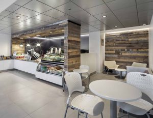 The fourth-floor lobby sundry store was also renovated into a coffee bar to create an additional amenity to the building with extended service hours. Both the coffee bar and the new cafeteria were designed with similar materials, creating an aesthetic connection.
