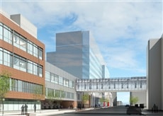 The Menino project includes the recent demolition of an existing infill building, a new 120,000sf addition, 220,000sf of renovations to the Menino Pavilion, and construction of a pedestrian bridge with elevator towers at each end.
