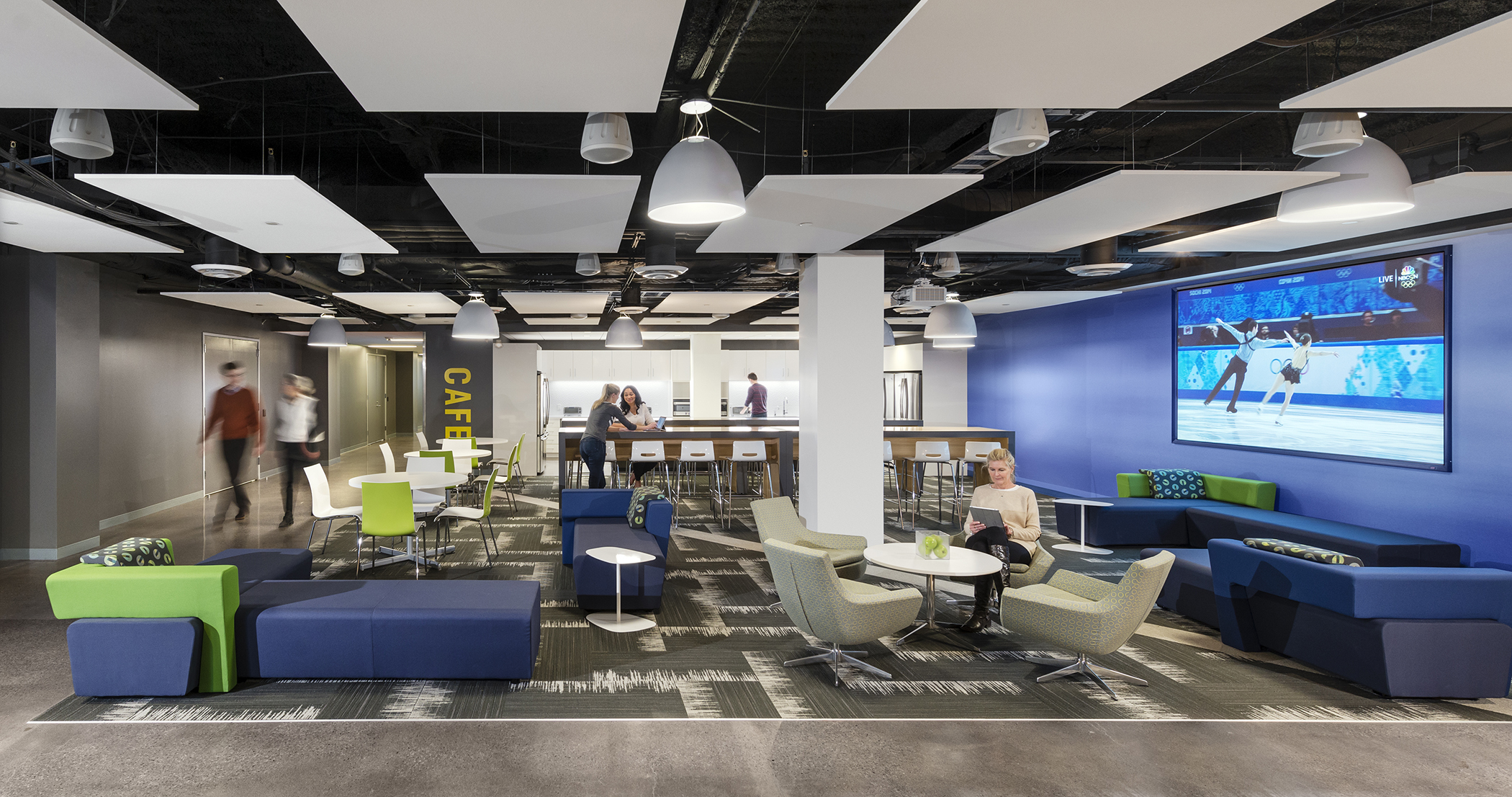 Working collaboratively with CBT Architects and Vanderweil Engineers, the team completed the new headquarters that accommodates 350 employees and includes: a network operating center that is the focal point of the new space; polished concrete floors throughout the receptions and main corridors; two outdoor spaces and a central café/town center that provides Compuware with a meeting / gathering space for all employees.