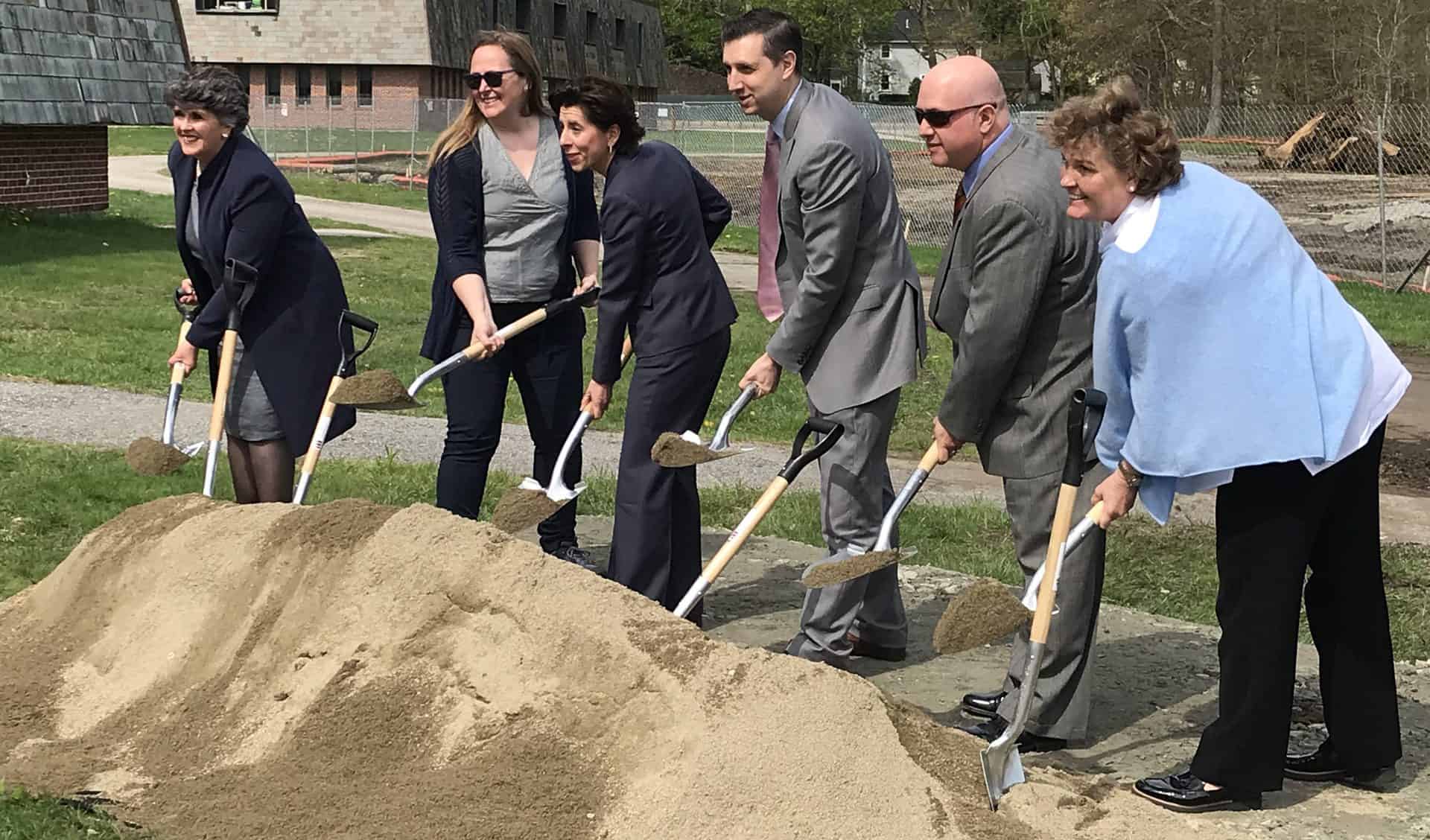 R.I. Gov. Gina Raimondo and State Treasurer Seth Magaziner (center) breaking ground with members of the Barrington School Committee.