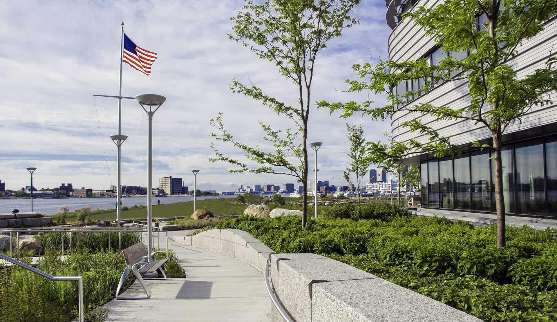 Between the Harborwalk and building, the landscape design subtly steps upward through a series of terraces and planting masses. By stepping the landscape, Copley Wolff Design Group’s landscape design not only addresses major practical challenges of designing for sea-level rise, it also complies with the American’s With Disabilities Act (ADA) with the integration of ramps, sloped walks, and stairs. Durable paving materials and a palette of salt-water tolerant plant materials were selected to mitigate damage during periods of major flooding. The complexity of the design was recently recognized by the Boston Society of Landscape Architects, which awarded the project a 2015 Honor Award for Commercial and Institutional Design.