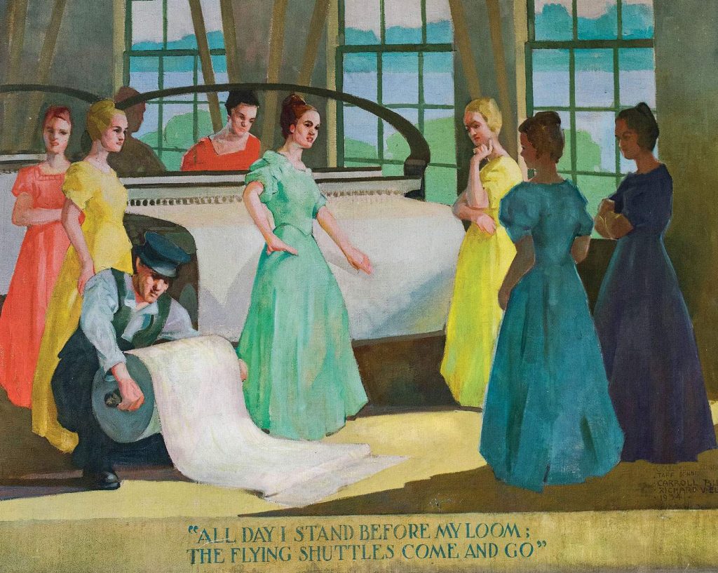 “The lobby murals of mill girls at work and at leisure are the only visible examples of a set of 1934 murals painted by Works Progress Administration artists during the Great Depression. A matching mural that runs the length of the ballroom will be restored after being painted over decades ago.”
