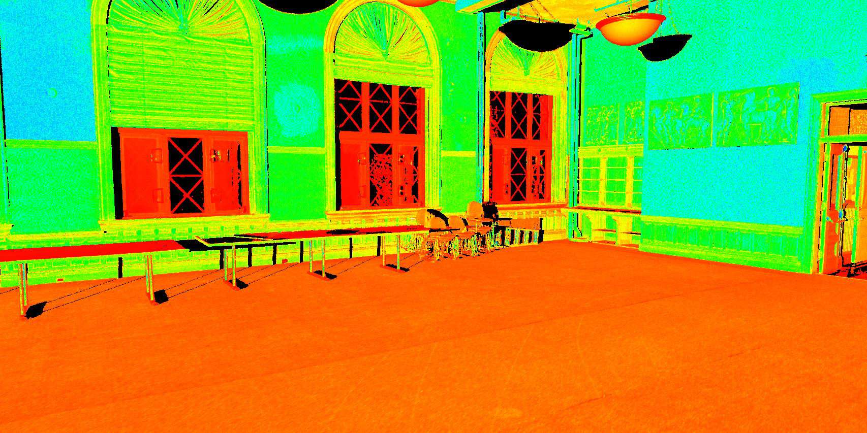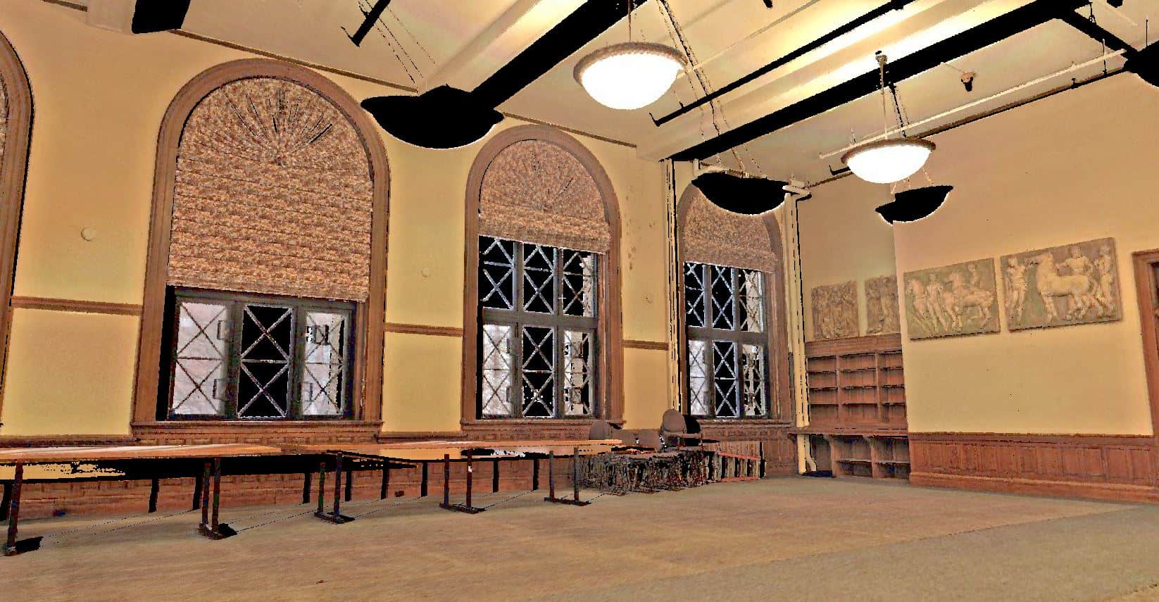 Laser surveys also provide a hands-off inventory of historic art and architecture. Coburn’s gems are no exception. According to UMass, “The series of 10 plaster casts of men on horses and a singing choir were made more than a century ago, from the frieze at the Parthenon, and then installed in Coburn around 1911.