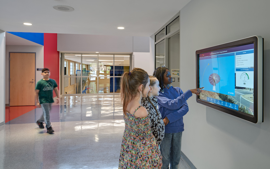 Located in the main lobby, the energy dashboard is used as a teaching tool, displaying real-time energy output and usage of the school.