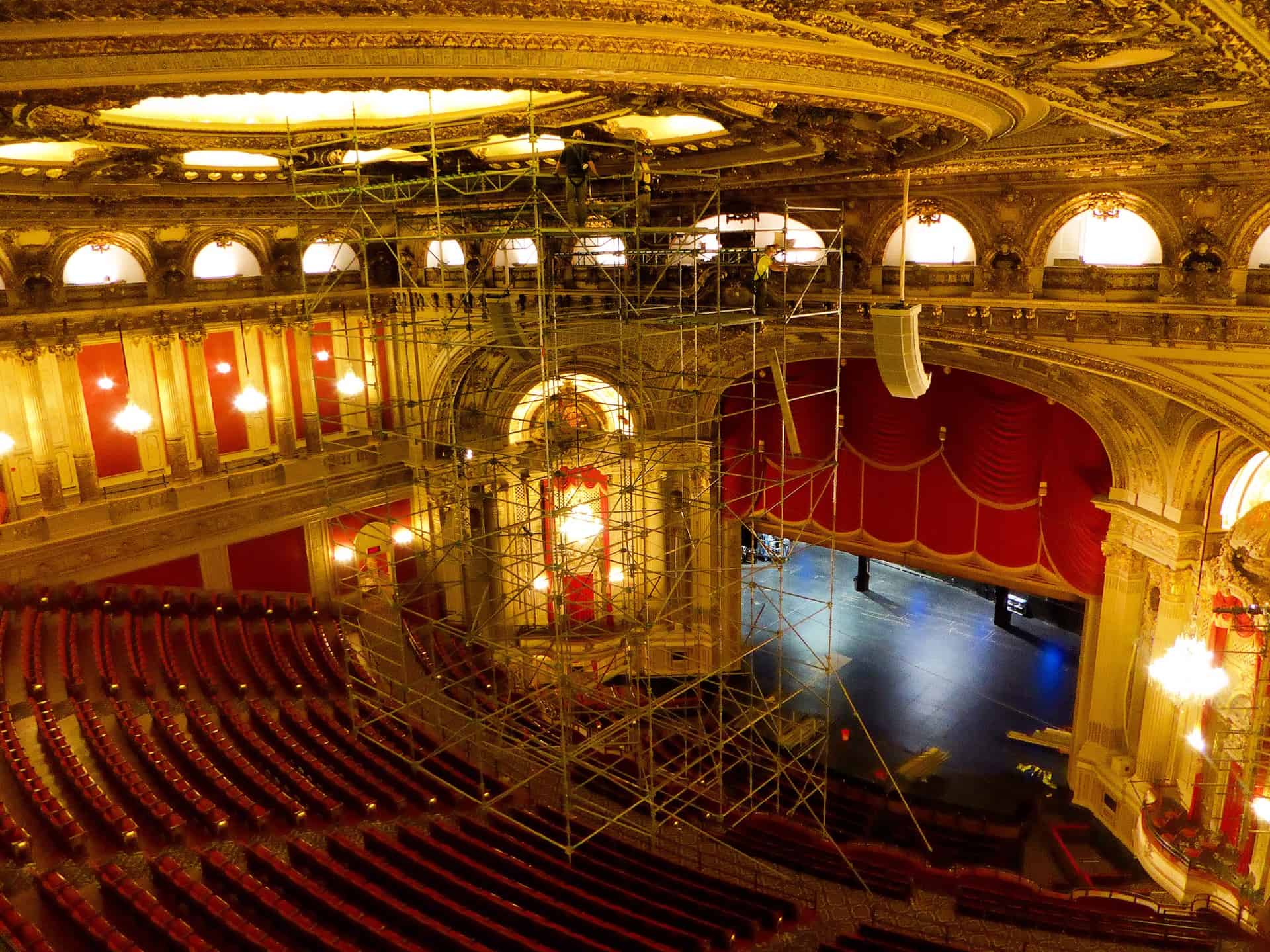 A crew of four scaffold erectors spent eight days installing the scaffold, carefully working around the existing theatre seating at varying elevations. The scaffold was in use for one week. After repairs were completed, the crew dismantled the towers promptly in order for the theatre to prepare for musical artist Jill Scott, who was set to grace the stage in mid-August.